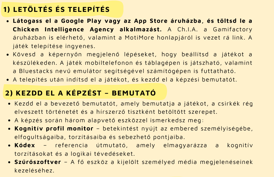 A Chicken Intelligence Agency egy Erasmus+ projekt keretében került fejlesztésre, amelyben partnerként részt vett a MotiMore is. A projekt célja az volt, hogy a tényellenőrzés és a médiaműveltség fejlesztését olyan eszközökkel támogassa, amelyek a fiatalok számára élményszerűek, motiválóak és könnyen alkalmazhatók az oktatásban.